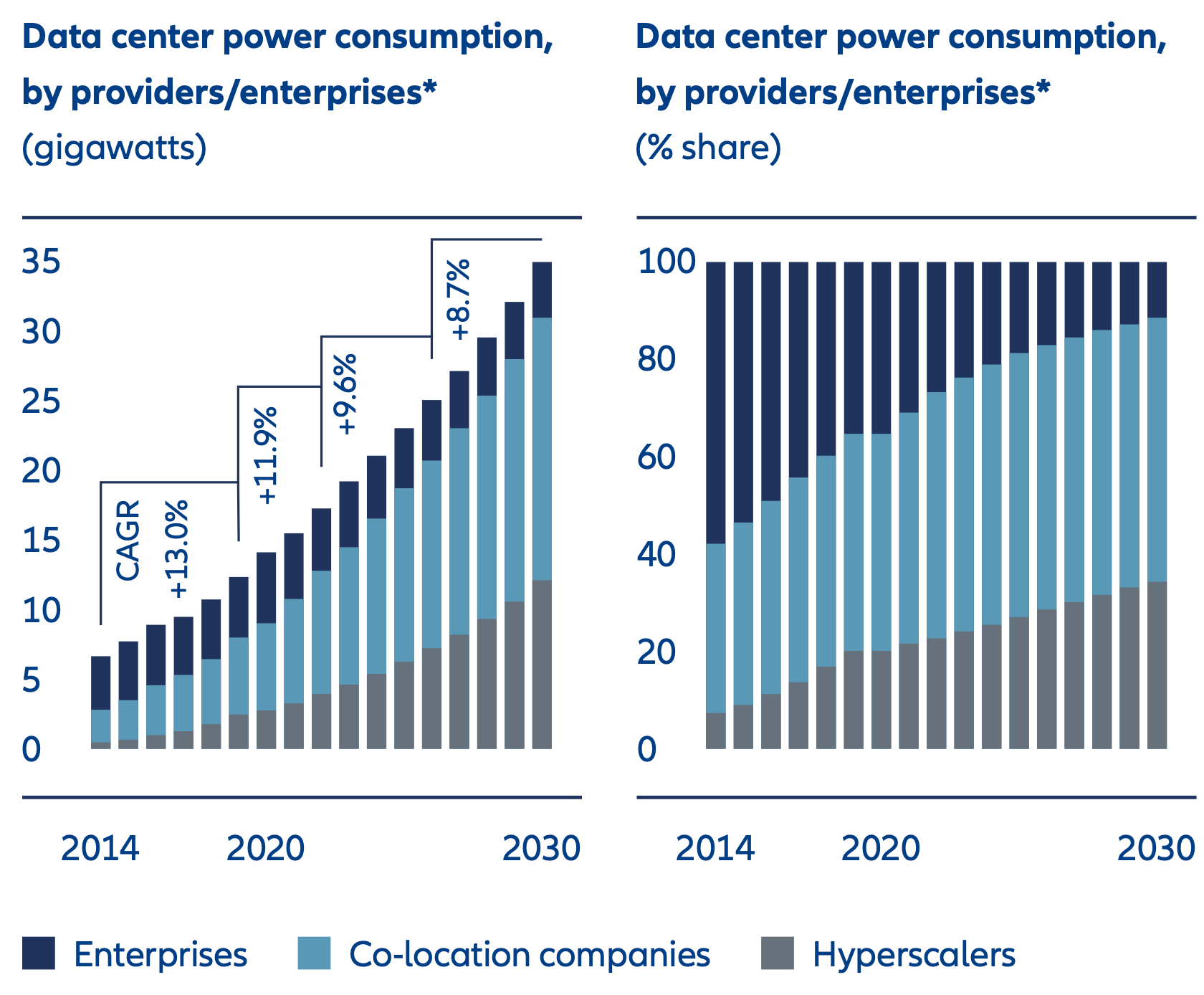 *Demand is measured by power consumption to reflect the number of servers a data center can house. Demand includes megawatts for storage, servers and networks. Source: Why invest in the data center economy, McKinsey