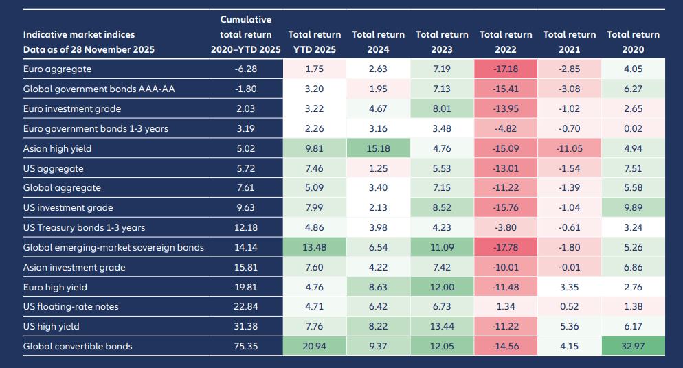 Source: Bloomberg, ICE BofA and JP Morgan indices; Allianz Global Investors, data as at 28 November 2025. Index returns in USD-hedged except for Euro indices (in EUR). Asian and emerging-market indices represent USD denominated bonds. The information above is provided for illustrative purposes only, it should not be considered a recommendation to purchase or sell any particular security or strategy or as investment advice. Past performance, or any prediction, projection or forecast, is not indicative of future performance.