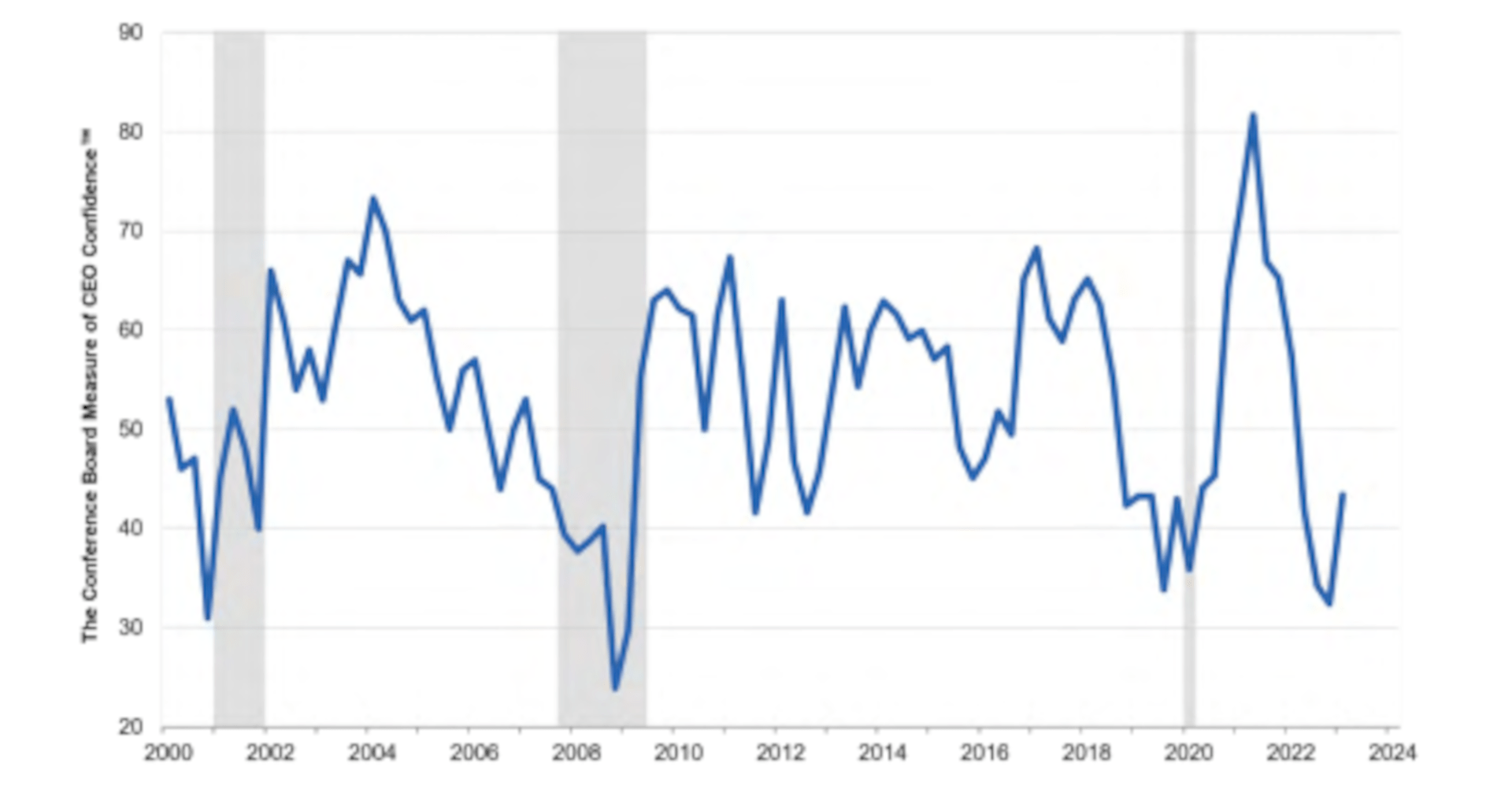 Note: shaded areas indicate periods of recession. Source: CEO Confidence (conference-board.org) as of 9 February 2023.